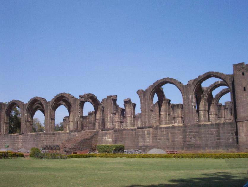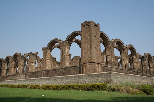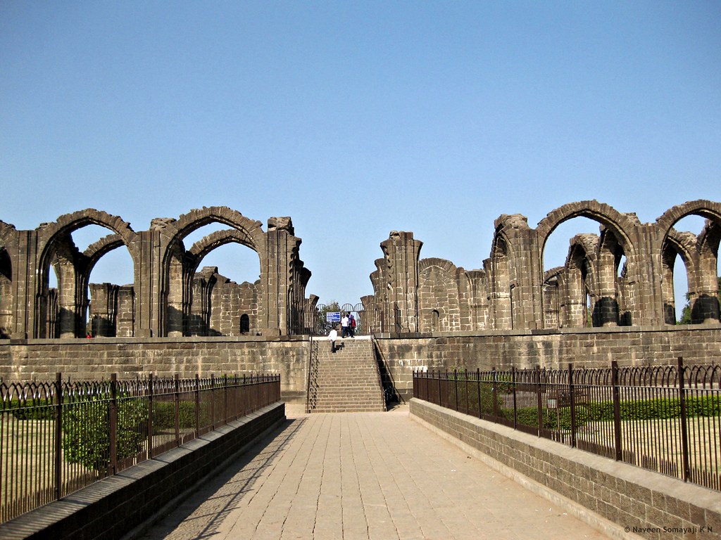 Almost in the centre of the city, and to the north-west of the citadel, is a large square building, roofless and with unfinished arches in dark basalt. This is the tomb of Ali Adil Shah II (1656-72). Probably begun on his accession to the throne in 1656 and intended to rival Gol Gumbaz, the tomb of his father, Muhammad Adil Shah. The building was conceived on a magnificent scale but was destined never to be completed. The platform is 20 feet high. This great elevated basement, on which the arches of this unfinished structure stand, is 215 feet square, while that of the Gol Gumbaz is 158 feet square. In the centre, on a raised platform, are the tomb stones of Ali Adil Shah II and some of his family members, the graves being in the crypt below, which is entered by a door on the east side. The whole structure with the lofty basement would, if it had been completed, have been a most graceful monument in Vijayapura. The building is well maintained with a beautiful garden around the monument. It is called BARA KAMAN by the people.