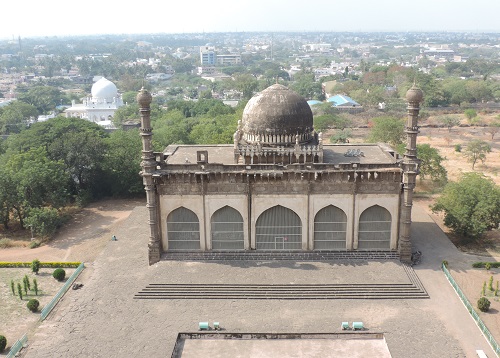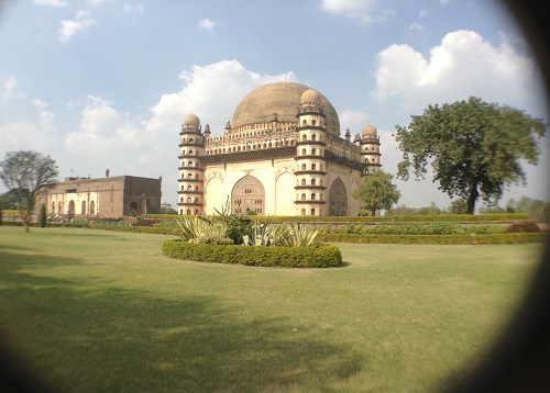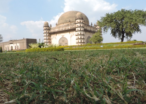 Dominating the sky line of Vijayapura city for miles around, is the Gol Gumbaz hailed as “One of the finest structural triumphs of the Indian builders.” Built by Muhammad Adil Shah, the seventh ruler of the Adil Shahi dynasty, between 1626-1656, as a mausoleum for himself, it boasts of the second largest dome in the world, after St.Peter’s at Rome. Contained within a walled enclosure in the midst of beautifully laid out gardens, the monument is an impressive structure. A square hall, 20 ft,. in length and breadth, is enclosed by four lofty walls rising to a height of 100 feet but tressed by octagonal towers, surmounted by a hemispherical dome on a petalled base. The enormous dome which has an internal diameter of 38 meters has a gallery around its base. The remarkable feature of this gallery is the acoustics, where the slightest whisper is magnified ten times earning it name of the Whispering Gallery. On a raised platform in the centre of the hall are the replica tombs of Muhammad Adil Shah and his family, enclosed by a wooden railing. The actual tombs lie in a crypt below. Visiting Timings: Morning 6 AM IST to Evening 6 PM IST