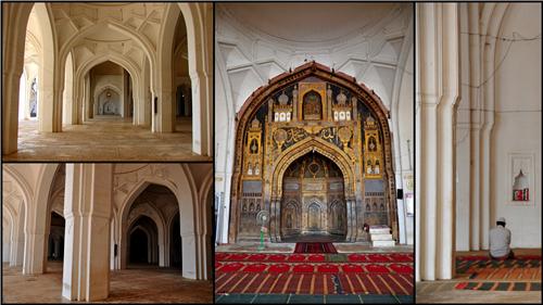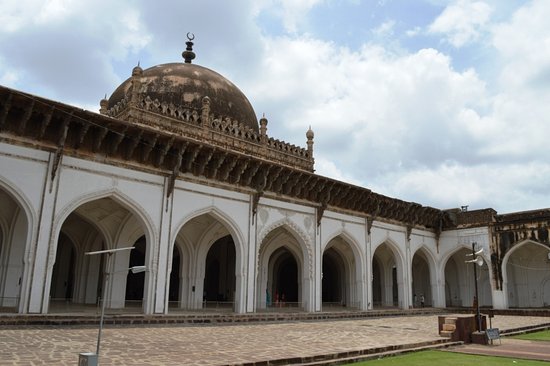 Built by Adil Shah-I (1558-1580), as a suitable place for worship for the ever increasing population of the city, the mosque is a finely proportioned, rectangular building with graceful arches. The Monument 1600 Sq.Ft. in area is most extensive among the edifices of Vijayapura. The flooring of the prayer hall is marked with 2250 musallahs (spaces for prayer), defined by black borders, each large enough for one worshipper, The Central miharb (an arched recess in the interior wall of a mosque) on the western wall, is covered with lines from the Holy Quran etched in exquisitely gilded calligraphy.